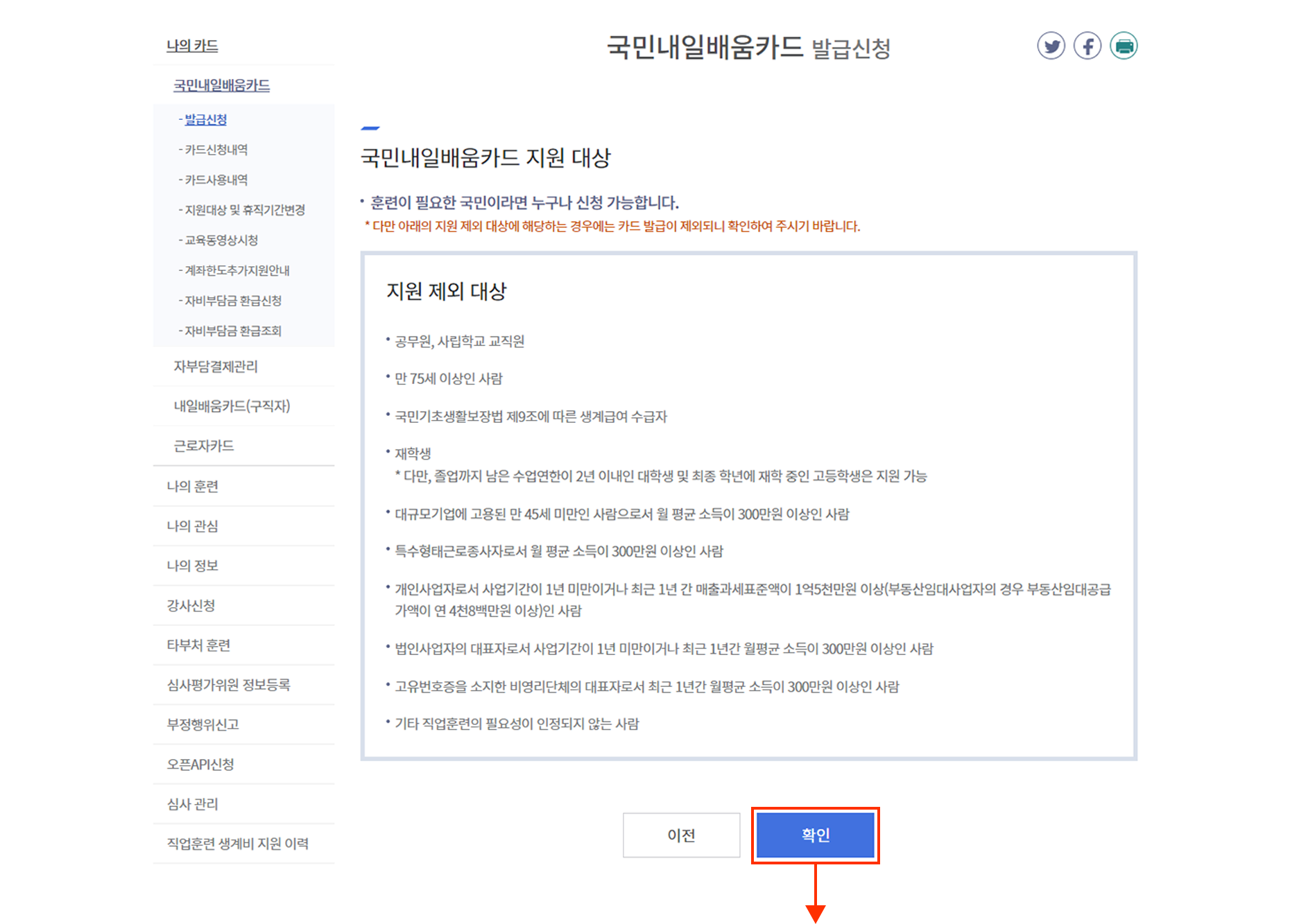 국민내일배움카드는 아래의 지원 제외 대상을 제외하고 훈련을 희망하는 국민이라면 누구나 신청 가능합니다.