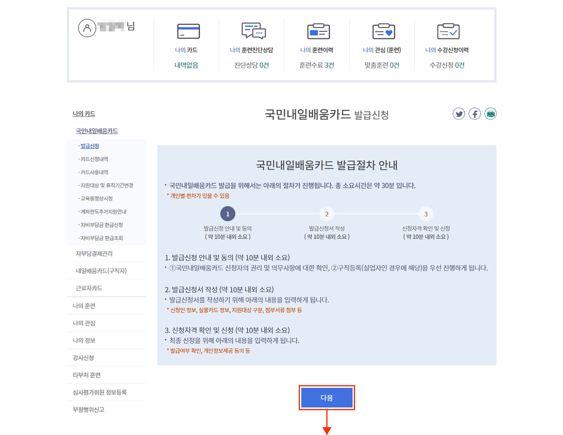 2. HRD-Net 홈페이지 로그인 후 나의 정보 페이지에서 나의 카드 > 국민내일배움카드 > 발급신청으로 이동하기.