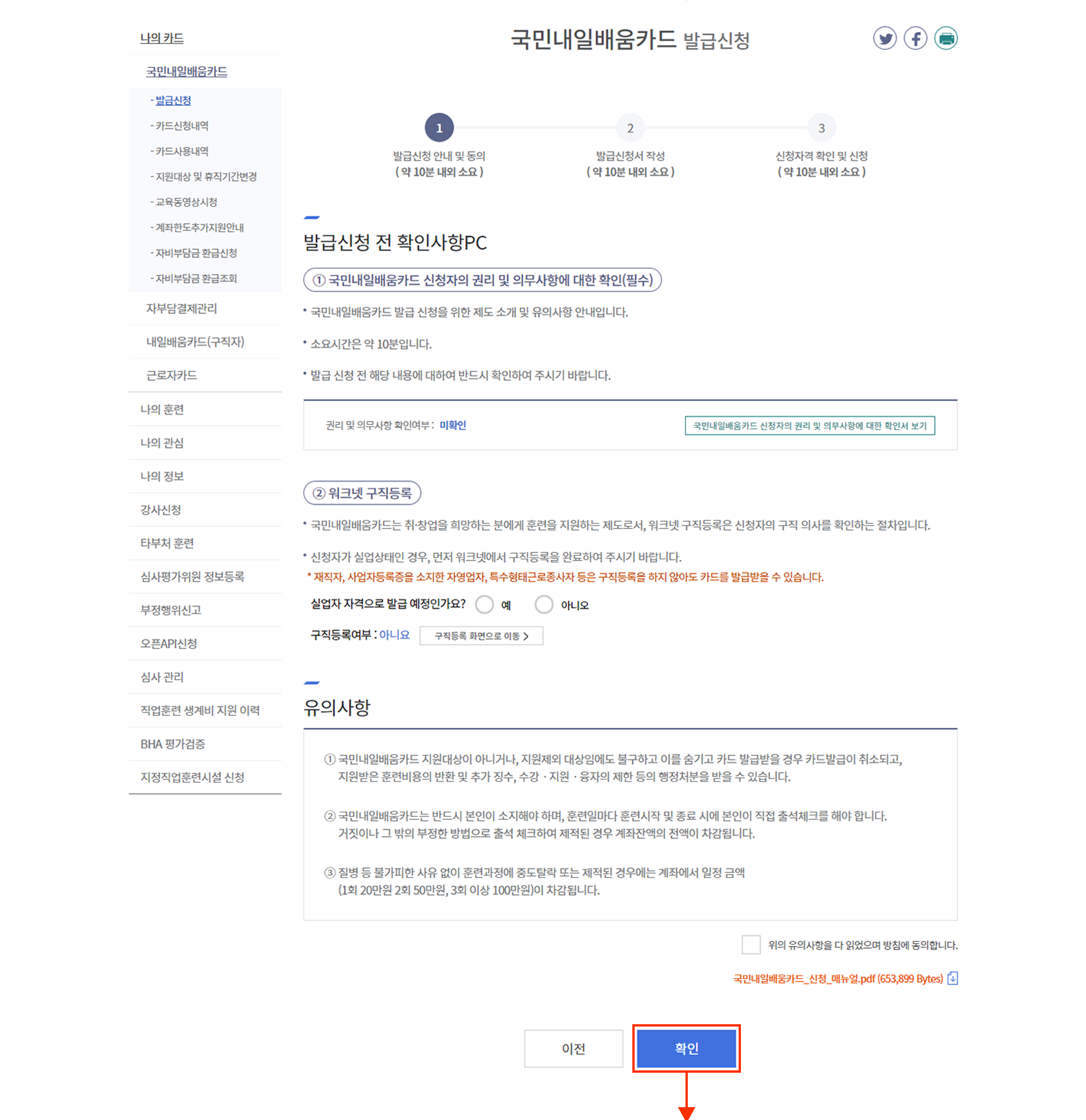 1. HRD-Net 홈페이지 로그인 후 메인화면에서 국민내일배움카드 '발급 신청'으로 이동하기.