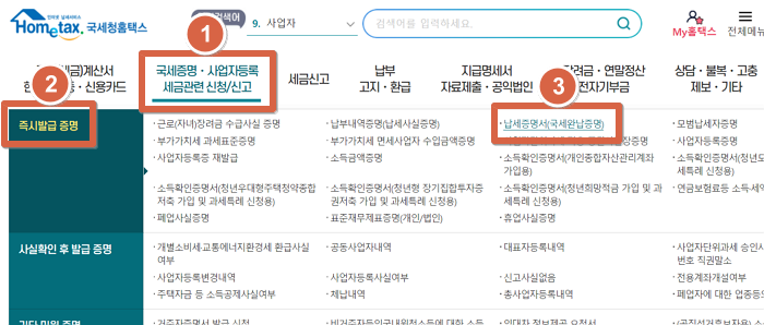 1. 국세청 홈택스에 접속하여 로그인한 다음,  상단 메뉴에서 국세증명ㆍ사업자등록 세금관련 신청/신고 메뉴의 즉시발급 증명을 선택한 다음 납세증명서(국세완납증명)를 선택합니다. 로그인을 하지 않은 경우라면 로그인 절차를 거칩니다.
