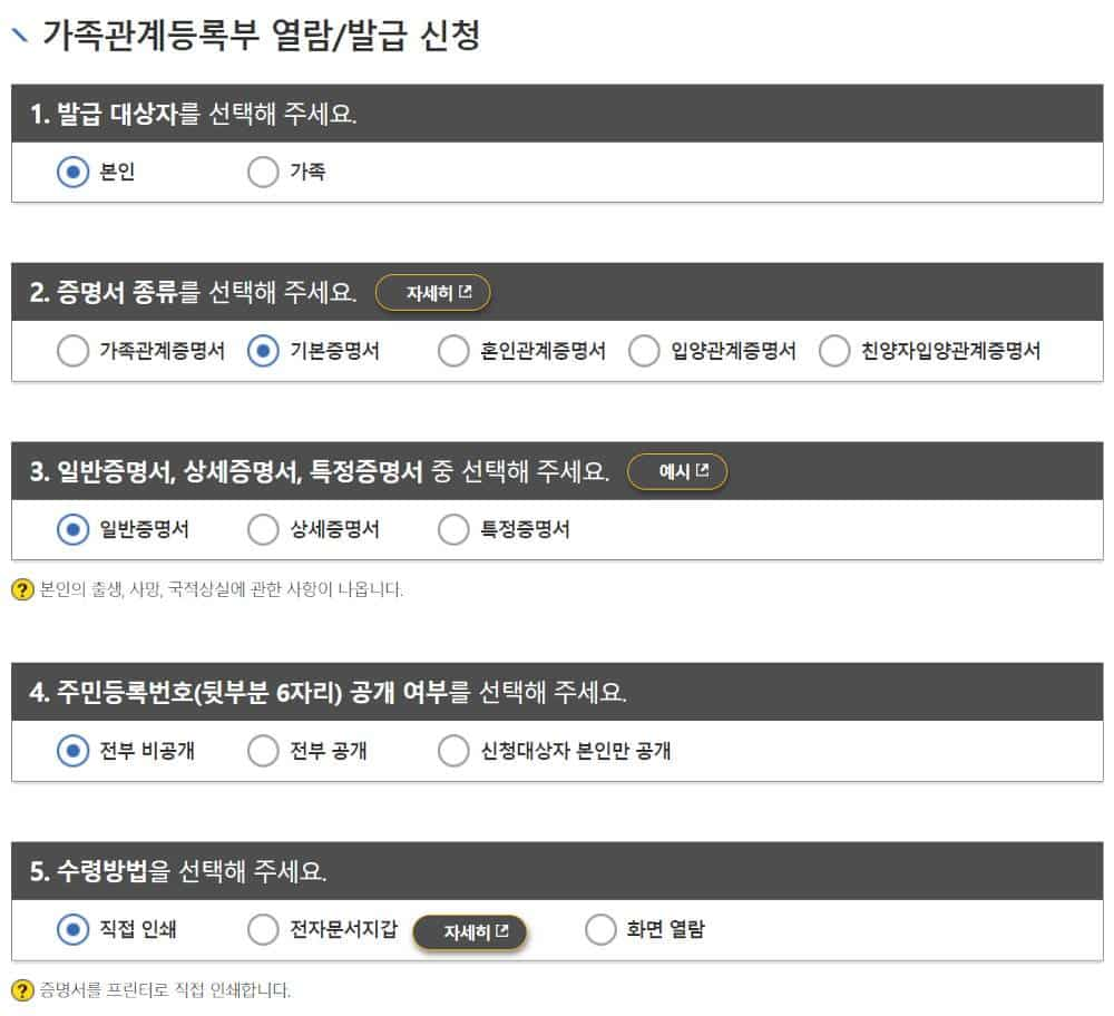 3. 가족관계등록부 열람/발급 신청 페이지에서 다음 항목들을 선택한 다음 신청하기 버튼을 누릅니다.