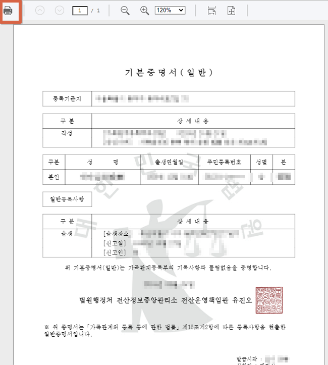4. 발급된 기본증명서 화면 좌측 상단의 프린터를 눌러 기본증명서를 출력하거나 저장할 수 있습니다.