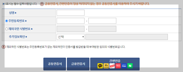 ⑶ 약관에 동의하고, 신청자 정보를 입력합니다. 가족관계증명서를 열람하거나 발급하려면 공인 또는 금융인증서, 간편 인증을 통해 인증과 본인 확인을 위한 정보를 추가 입력합니다.