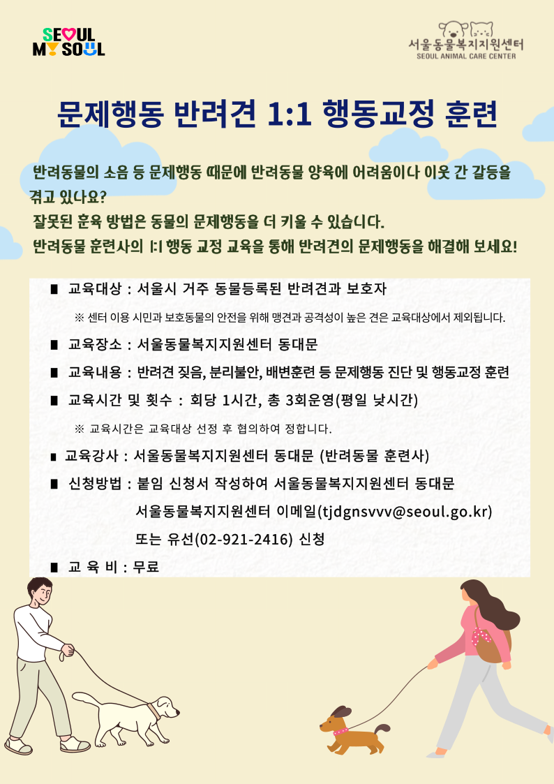 신청방법 : 아래 첨부한 '문제행동반려견행동교정 훈련신청서'를 작성하여 서울동물복지지원센터 동대문 이메일(tjdgnsvvv@seoul.go.kr) 또는 유선(02-921-2416)으로 신청