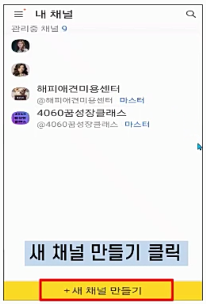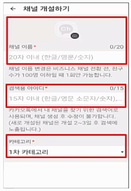 4. 채널 이름, 검색용 아이디, 카테고리, 소개메시지를 입력하고 새 채널 만들기를 눌러 개설을 완성합니다.