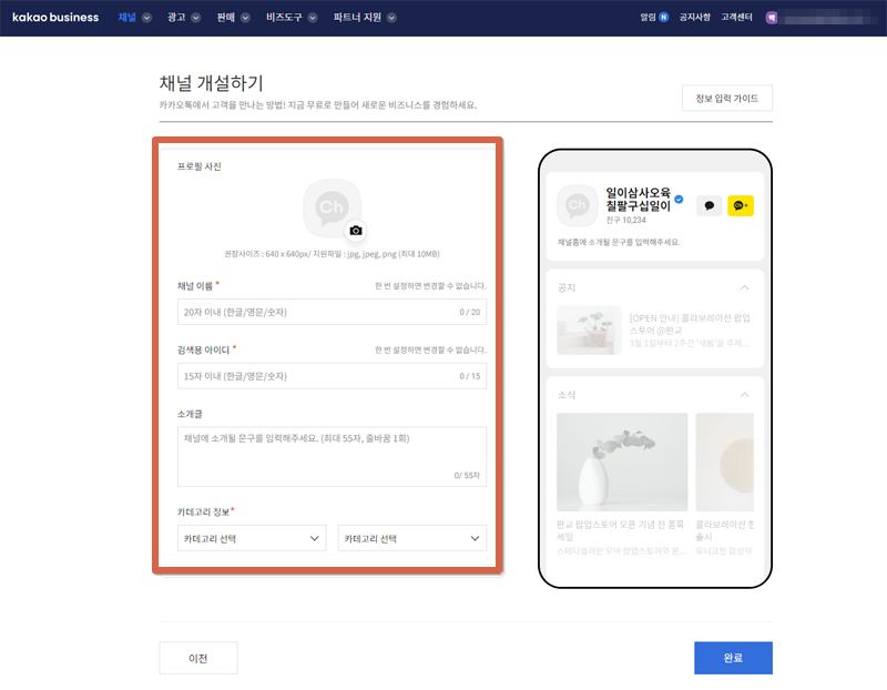 3. 프로필 사진을 업로드하고, 채널 이름, 검색용 아이디, 소개글을 입력한 다음 카테고리를 설정하고 완료 버튼을 클릭하여 채널을 생성합니다.