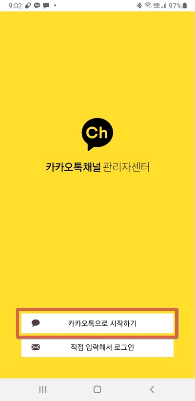 2. 카카오톡채널 관리자센터 앱을 실행시킨 다음 카카오톡으로 시작하기를 눌러 다음으로 넘어갑니다.