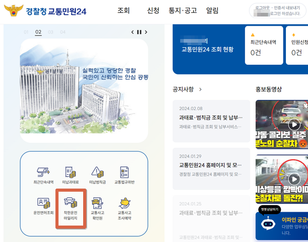 경찰청 교통민원24 홈페이지에서 하단의 착한운전 마일리지 버튼을 클릭하거나, 상단 메뉴에서 신청 - 착한 운전마일리지신청 메뉴를 선택합니다.