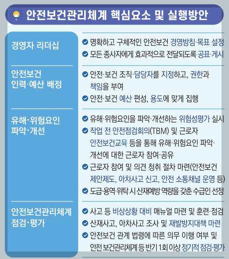 중대재해처벌법의 핵심은 기업이 스스로 경영책임자를 중심으로 "안전보건관리체계"를 구축하고 이행하는 것이며,