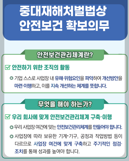 - 안전·보건 관리체계 구축·이행 의무를 위반하여 중대산업재해에 이르게 한 사업주 또는 경영책임자에게 그 책임을 묻습니다.
