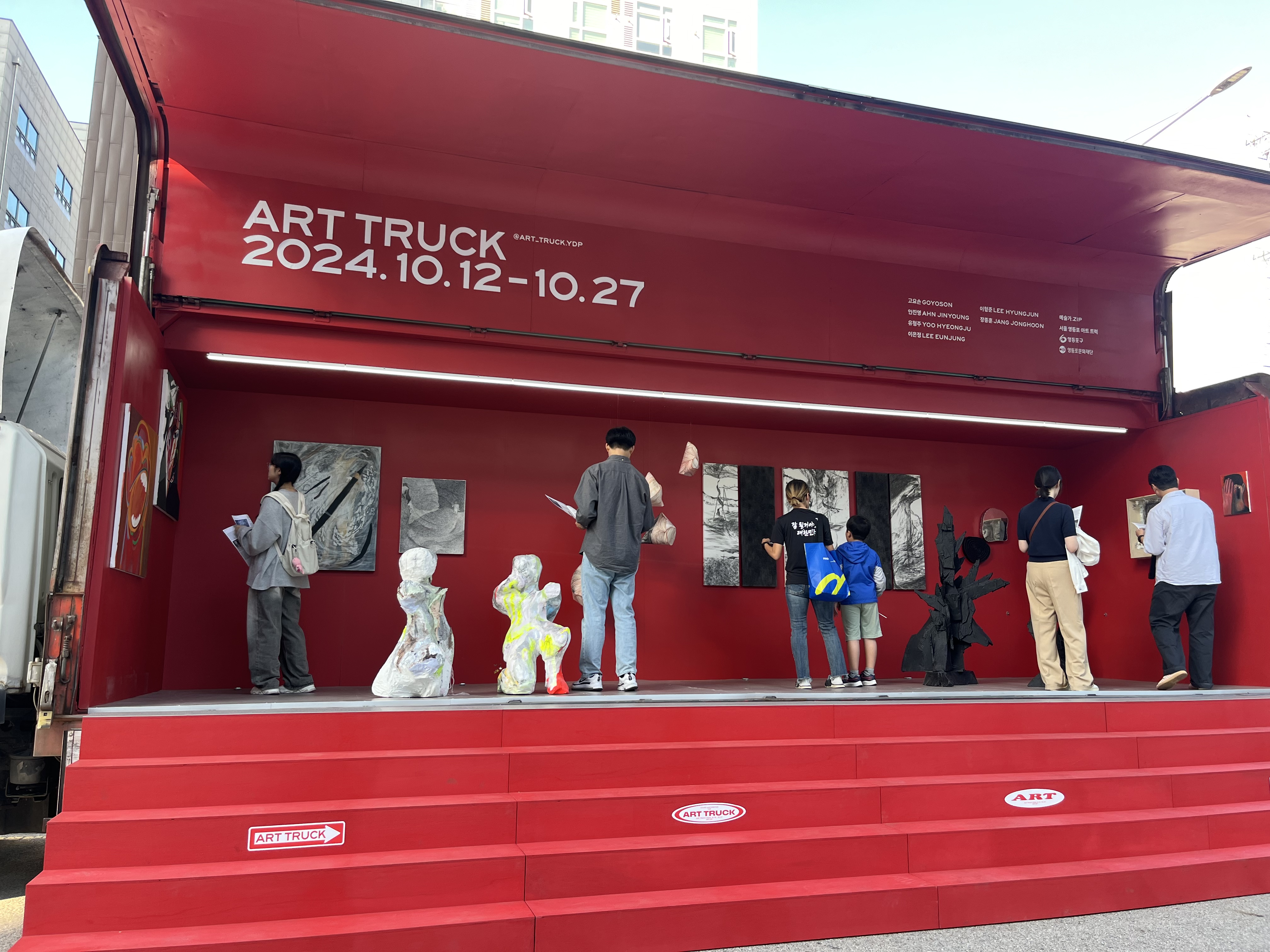 • 트럭을 통한 전시: 대형 화물 트럭이 전시장 역할을 맡아, 다양한 작품을 선보입니다.