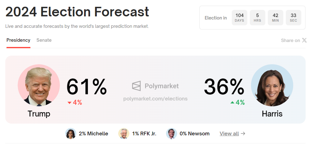 대선 후보 공식 지명 절차만을 남겨둔 현직 대통령이 재선 도전을 공식 포기하는 미국 역사상 초유의 상황이 발생하면서 미국 대선판이 요동치고 있고, 바이든 대통령이 당 후보로 지지한 카멀라 해리스 부통령이 대안으로 떠오르고 있지만 트럼프 전 대통령의 승리 예측 분위기도 여전히 이어가는 분위기입니다.