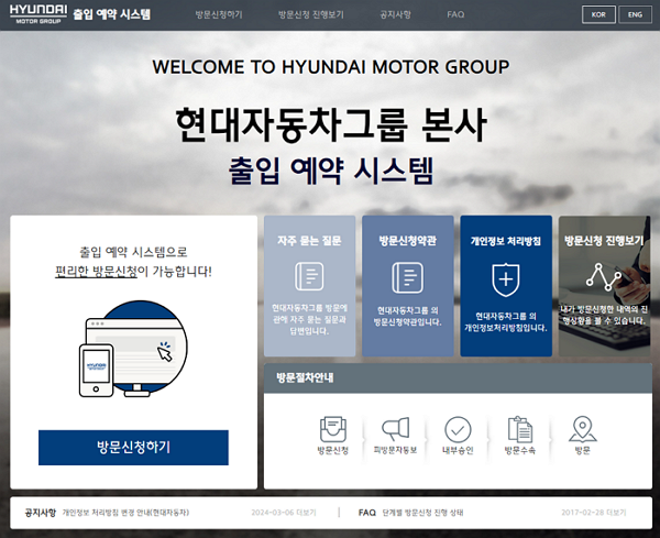 현대모터그룹/현대자동차 출입 예약시스템은 현대자동차그룹의 시설에 방문하실 때 필요한 예약 시스템으로, 방문객들이 안전하고 효율적으로 현대모터그룹의 시설을 이용할 수 있도록 도입된 서비스입니다.